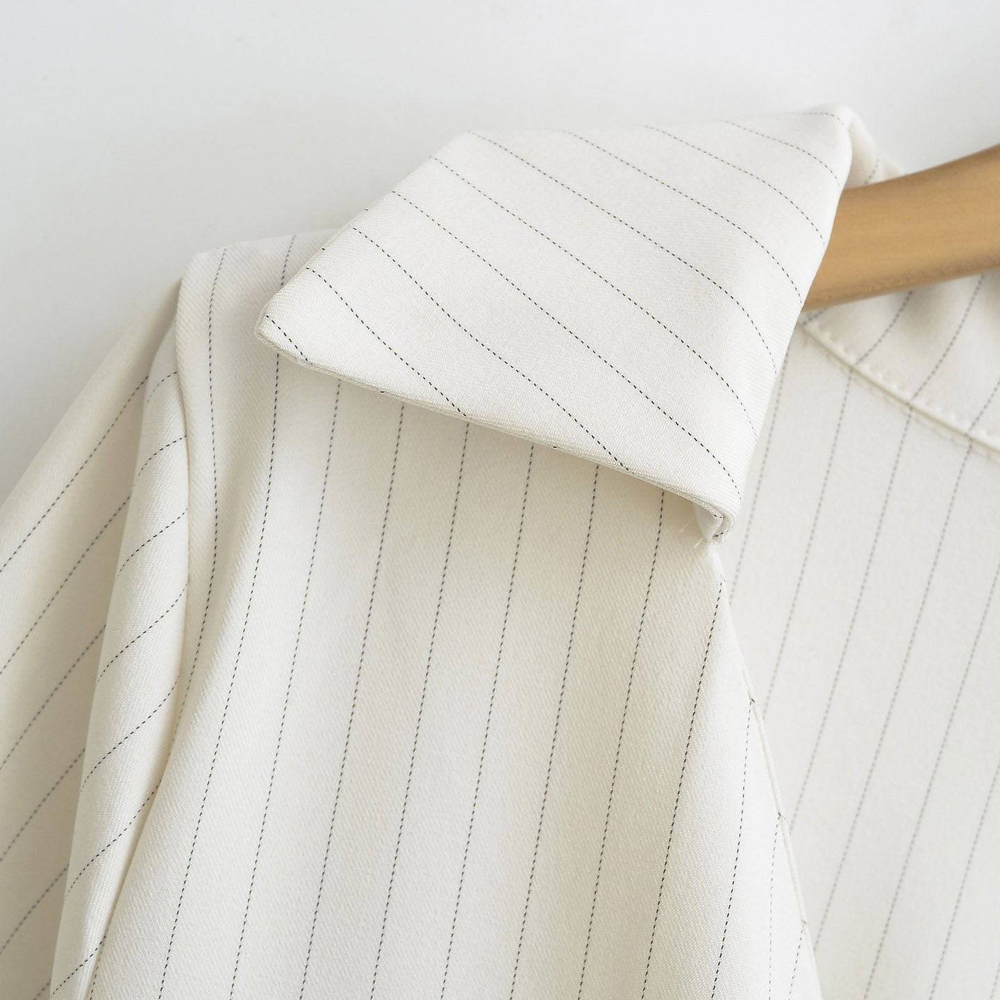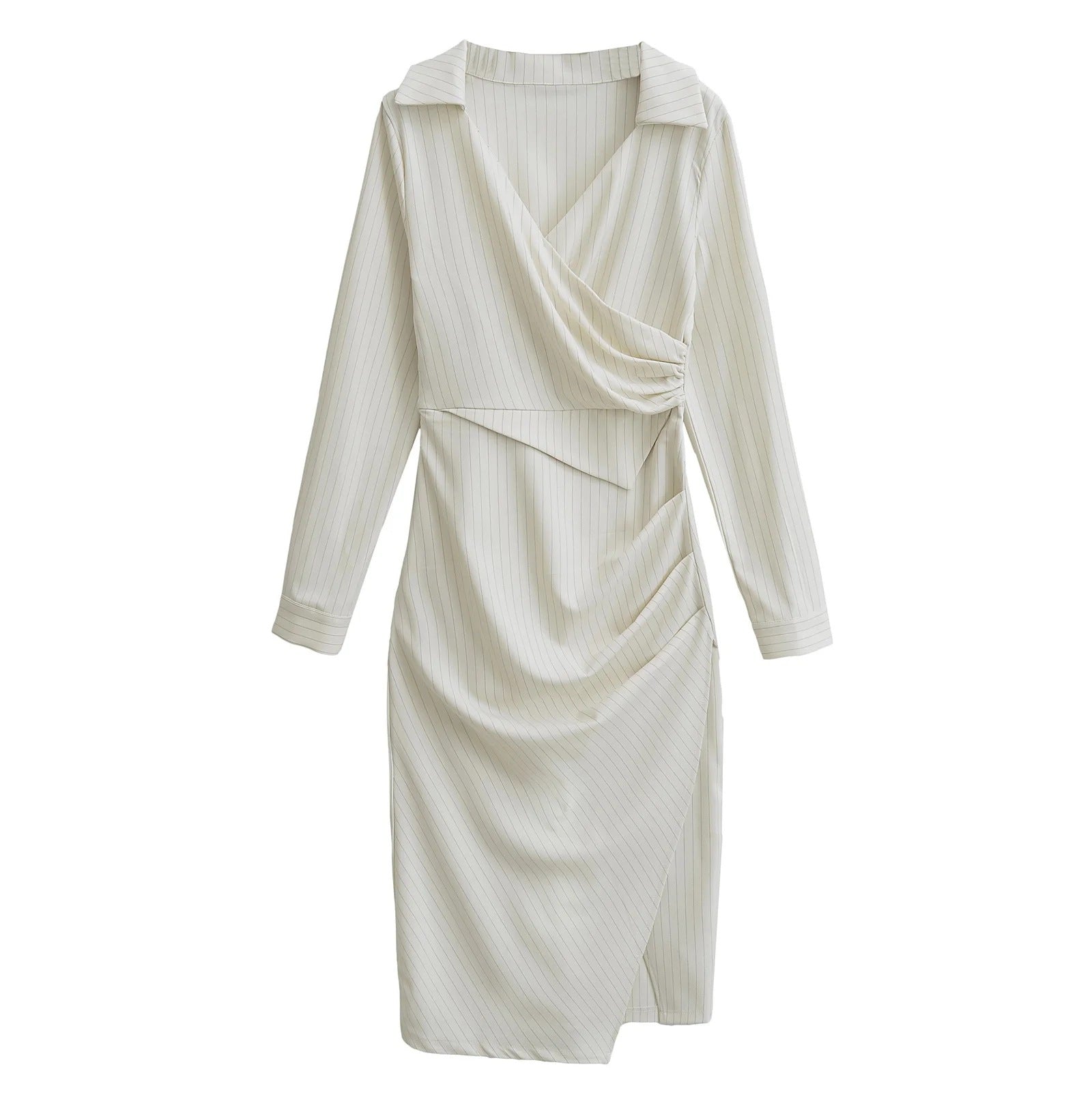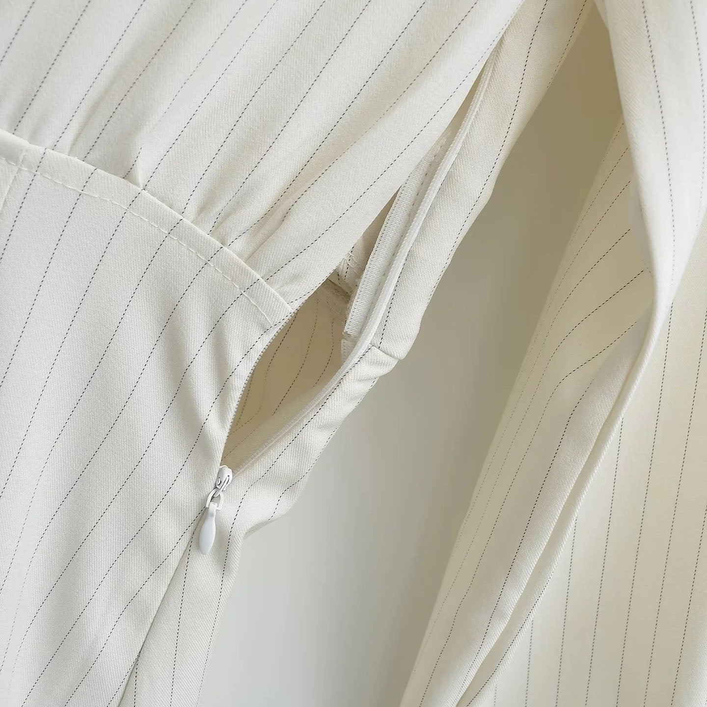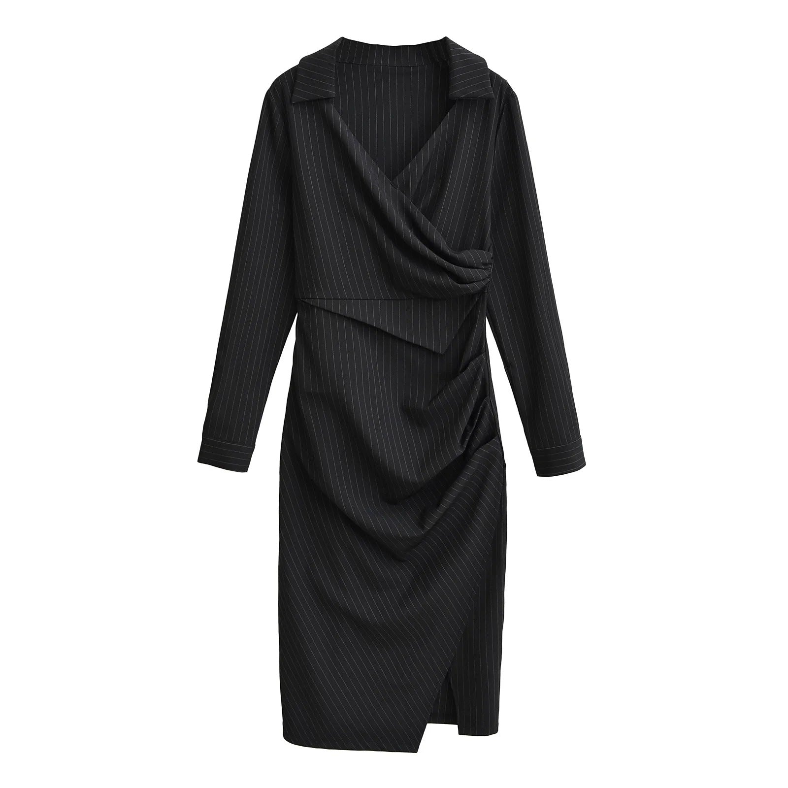 This dress features a sharp asymmetrical wrap design that enhances your silhouette with precision. The classic pinstripe pattern pairs with a deep V-neckline and structured collar for a sleek, modern finish. Long sleeves and a front slit complete the look, balancing coverage with bold detail.